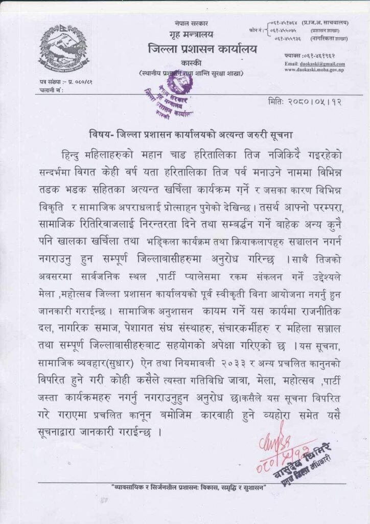 हिन्दु महिलाहरुको महान पर्व हरितालिका तिजका नाममा परम्परा र रितिरिवाज बाहिर रहेका तडकभडक, भड्कीला कार्यक्रम नगर्न जिल्ला प्रशासन कार्यालय कास्कीले अनुरोध गरेको छ । यदि यस्तो कार्य गरेमा कानून बमोजिम कारवाही गरिने समेत कास्की प्रशासनले बताएको छ ।