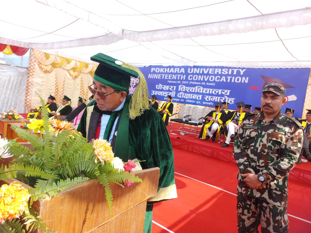 समारोहमा पोखरा विश्वविद्यालयका उपकुलपति प्रेमनारायण अर्यालले विश्वविद्यालयको अवस्था र भावी योजनामाथि प्रकाश पारेका थिए । पोखरा विश्वविद्यालय ऐन २०५३ अनुसार २०५४ मा स्थापित पोखरा विश्वविद्यालयका चार आंगिक महाविद्यालय छन् । विश्वविद्यालयमा एक सय ४५ स्थायी र ५२ करार शिक्षक र दुई सय १२ कर्मचारी कार्यरत छन् । पोखरा विश्वविद्यालयमा तीन संयुक्त आंगीक र ५८ सम्बन्धन प्राप्त महाविद्यालयमा ६४ कार्यक्रममा अहिले ३५ हजार दुई सय ४० विद्यार्थी छन् । चाडै विभिन्न तहमा १६ कार्यक्रम थप गर्ने लक्ष्य लिएको यो विश्वविद्यालयले गत सालबाट पोखरा–३०, खुदीमा एक सय शैयाको शिक्षण अस्पतालसमेत सञ्चालन गरेको छ ।