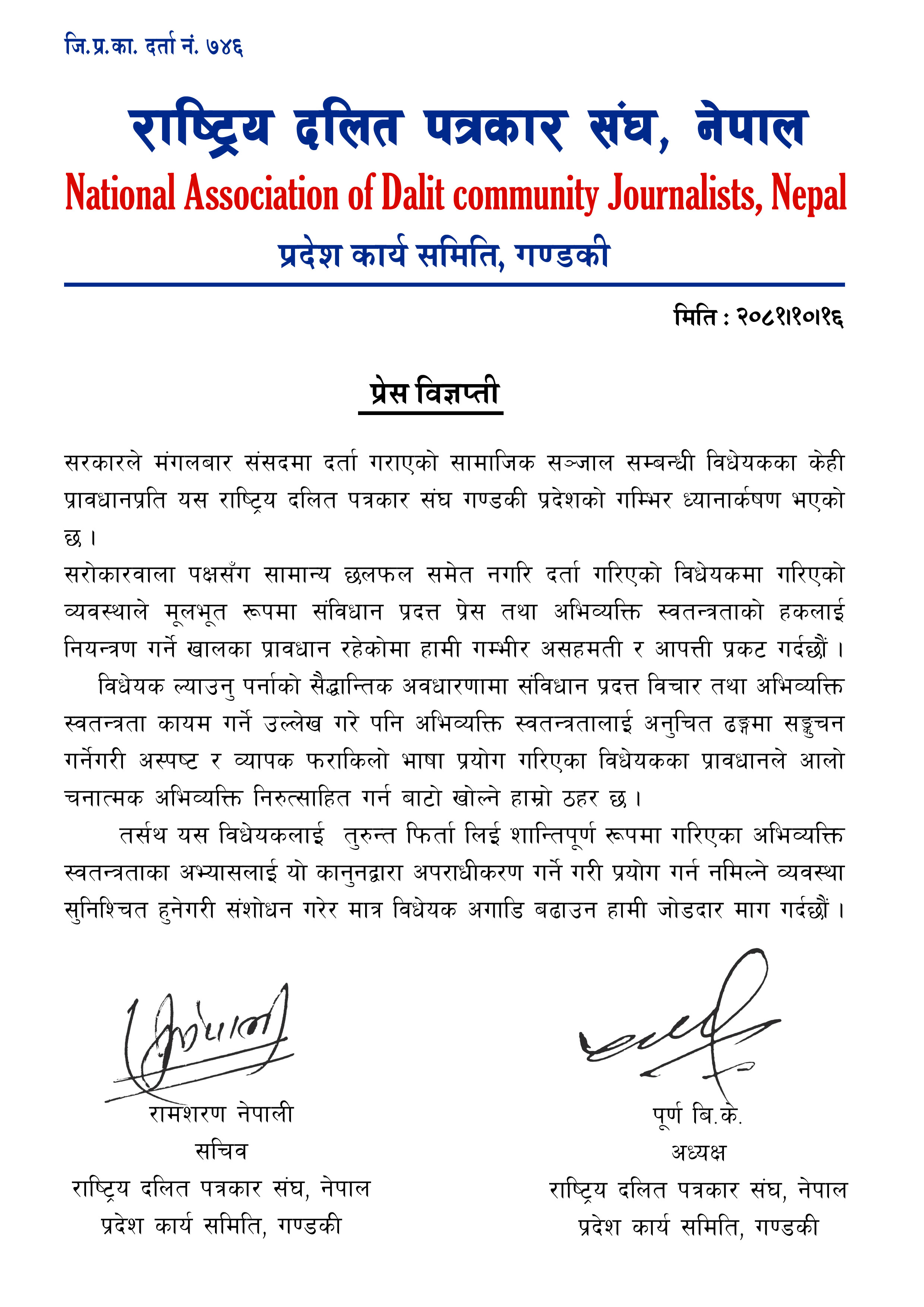पोखरा, १६ माघ । सरकारले मंगलबार संसदमा दर्ता गराएको सामाजिक सञ्जाल सम्बन्धी विधेयकप्रति राष्ट्रिय दलित पत्रकार संघ गण्डकी प्रदेशले विरोध जनाएको छ । संघले बुधबार विज्ञप्ती जारी गर्दै विधेयकमा रहेका प्रावधानप्रति आफ्नो गम्भिर ध्यानार्कषण भएको र विधेयक तत्काल फिर्ता लिई संशोधन गरेर मात्र विधेयक अगाडि बढाउन माग गरेको छ ।