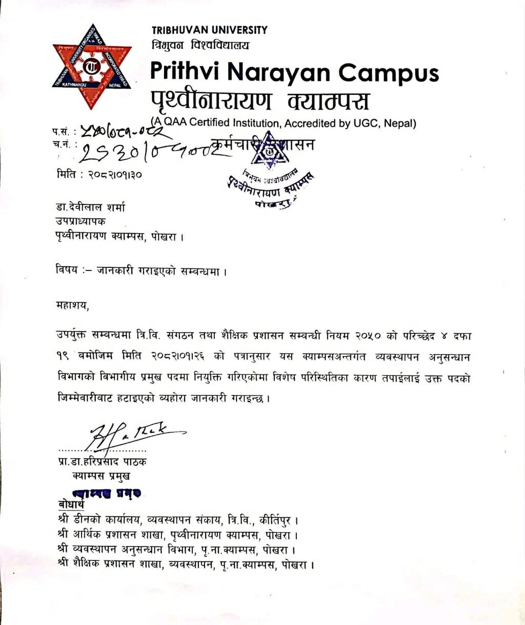 पोखरा । पोखराको पृथ्वीनारायण (पीएन) क्याम्पसका व्यवस्थापन संकायका शिक्षक डा. देविलाल शर्मालाई जातीय दुर्व्यवहार गरेको आरोप लागेको छ । व्यवस्थापन संकायतर्फ एमबिए फाइनन्स विषयको शैक्षिक अवलोकन भ्रमणका विद्यार्थी अमन परियारलाई जातीय दुव्यर्वहार गरेको लागेको हो ।