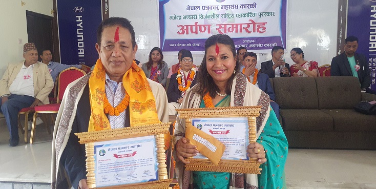 नेपाल पत्रकार महासंघ कास्कीले शुक्रबार स्वर्गीय भण्डारीका ७२ औँ जन्मजयन्ती पारेर पुरस्कार प्रदान गरेको हो । कार्यक्रममा प्रदेश प्रमुख डिल्लीराज भट्टले उनीहरूलाई जनही २५ हजार र सम्मानपत्र प्रदान गरे । दुबै पत्रकार दुई दशकभन्दा बढी समयदेखि निरन्तर पत्रकारितामा क्रियाशील छन् ।