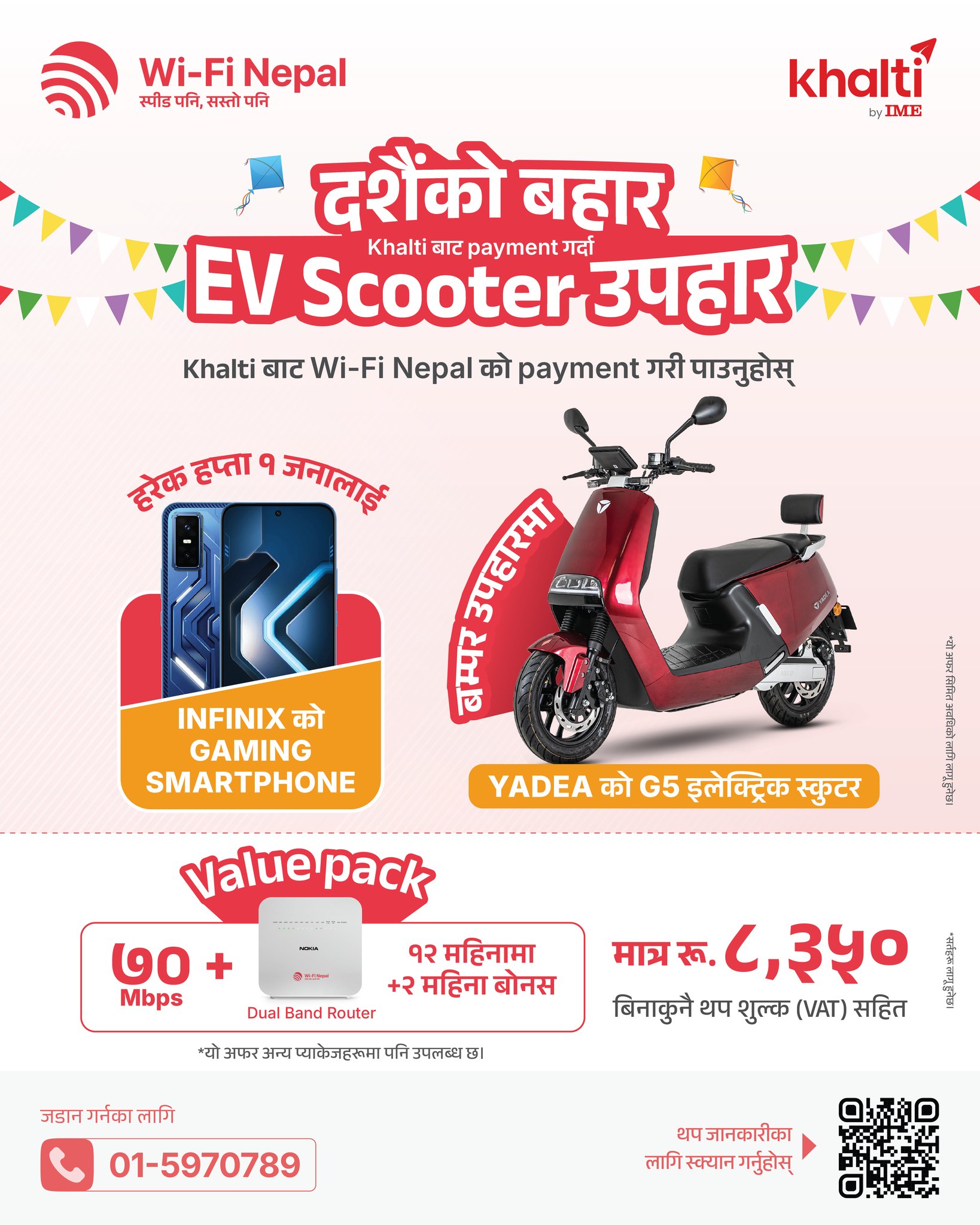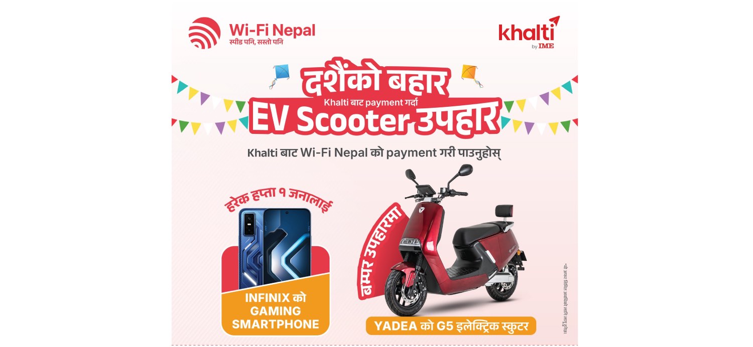 यस अफर अन्तर्गत Khalti मार्फत Wi-Fi Nepal को इन्टरनेट शुल्क तिर्ने ग्राहकहरू मध्ये हरेक हप्तामा १ जना भाग्यशालीले Infinix Gaming Smartphone प्राप्त गर्नेछन् भने, ग्राण्ड उपहारको रुपमा अत्याधुनिक Yadea G5 इलेक्ट्रिक स्कुटर प्रदान गरिनेछ ।